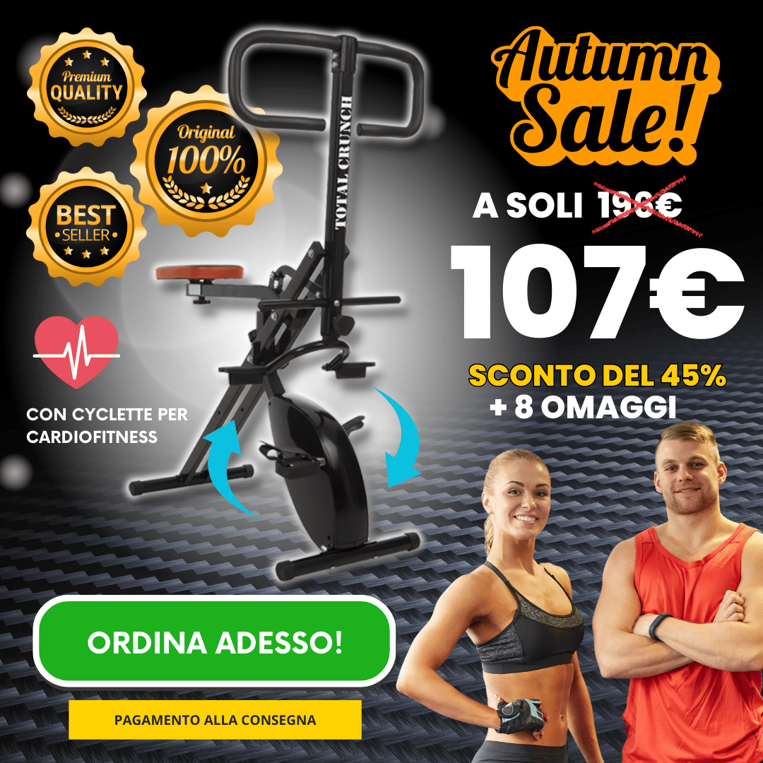 TOTAL CRUNCH CYCLETTE utilizza il rivoluzionario sistema di "simmetria inversa": durante la salita le braccia sono flesse e le gambe sono distese, e viceversa durante la discesa. Ciò consente di ottenere due risultati allo stesso tempo: